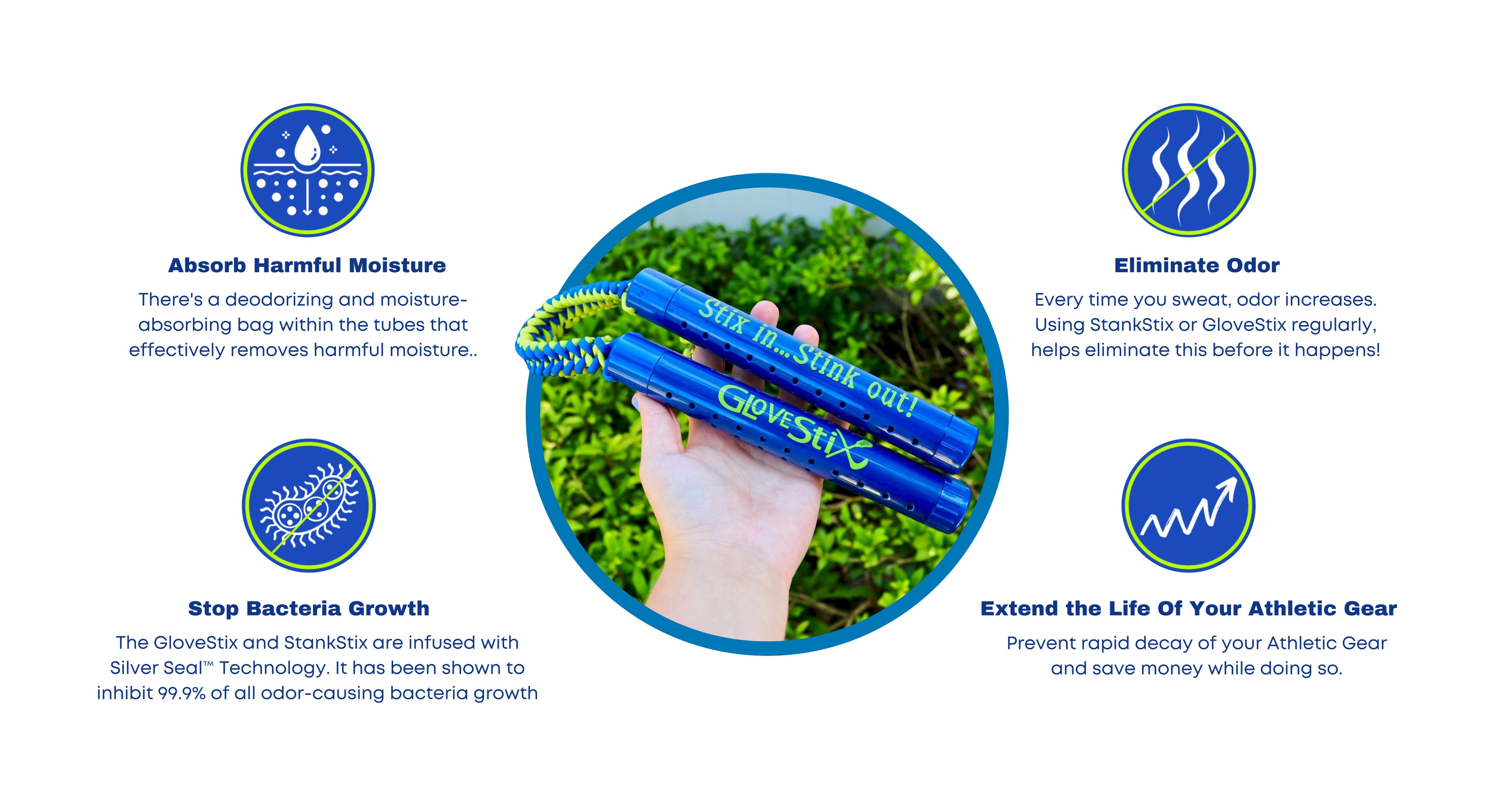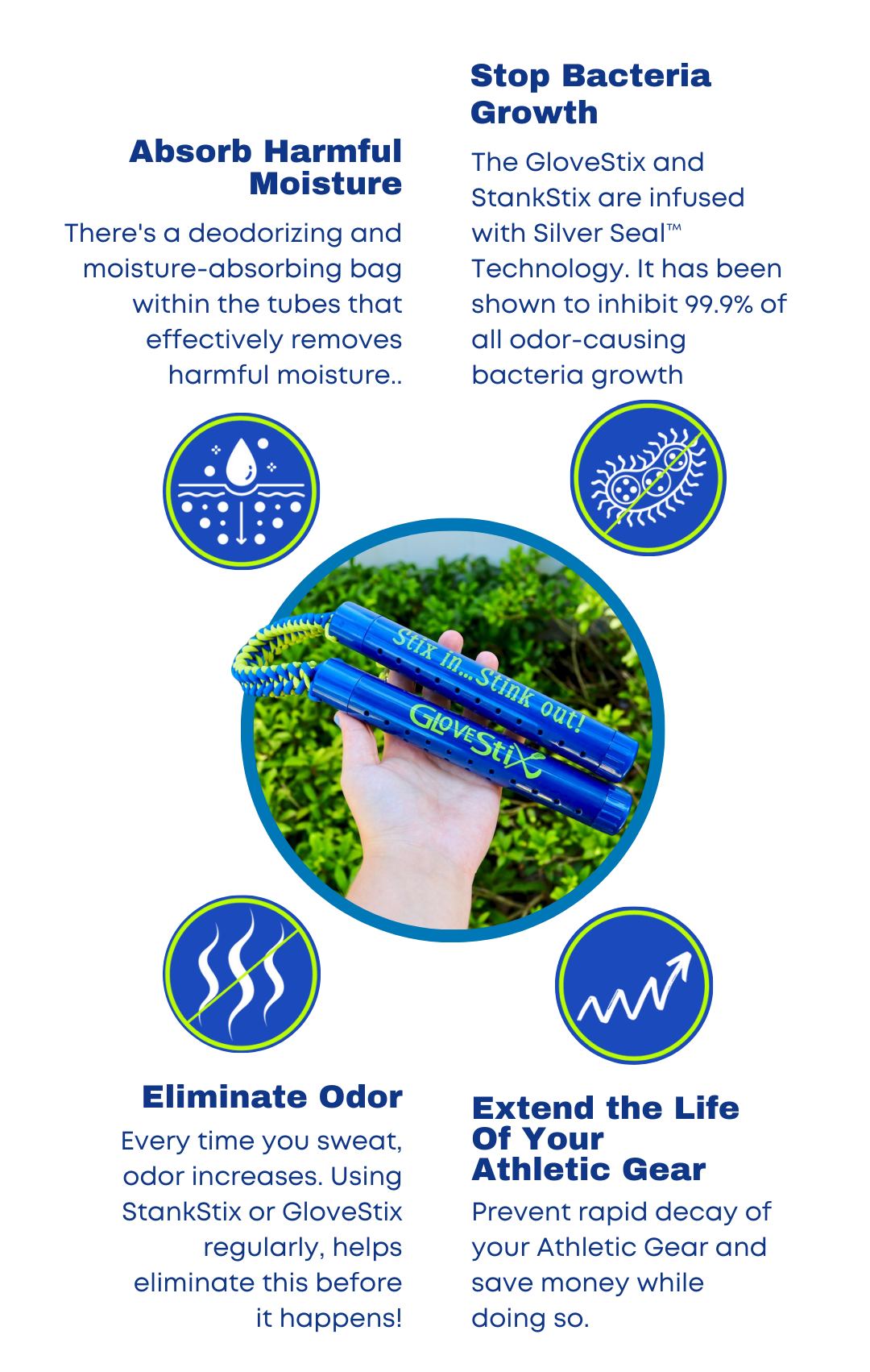 Stix In…Stink Out. Our GloveStix and StankStix work quickly, are safe, non-toxic and will reduce the stinky smell from gloves, shoes and more. The patented silver ion antimicrobial technology in the Stix do not mask the smell they work hard to neutralize it!Our Stix can remove the stink from your athletic gloves, shoes, boots, cleats, gym bags, and more.