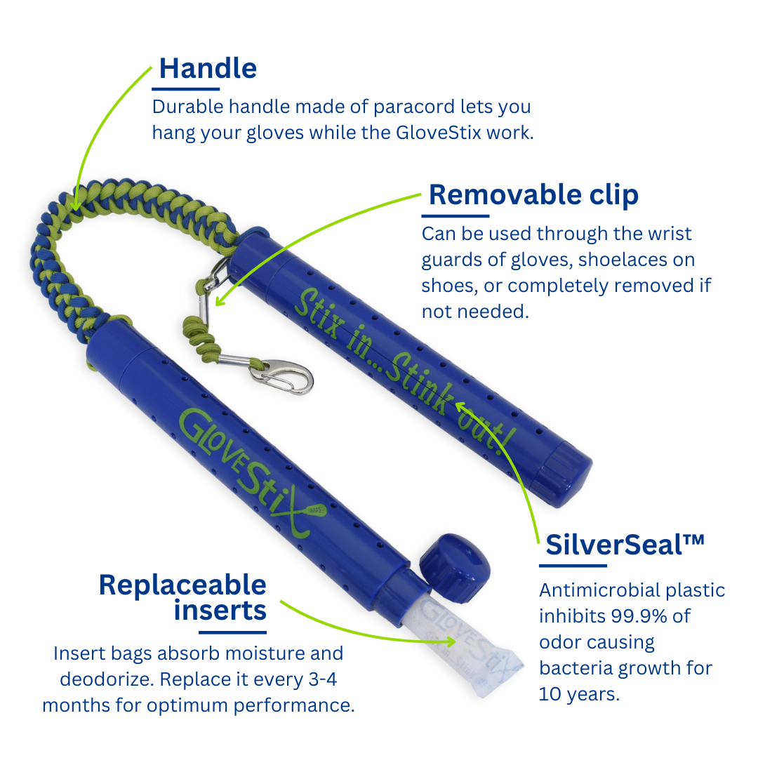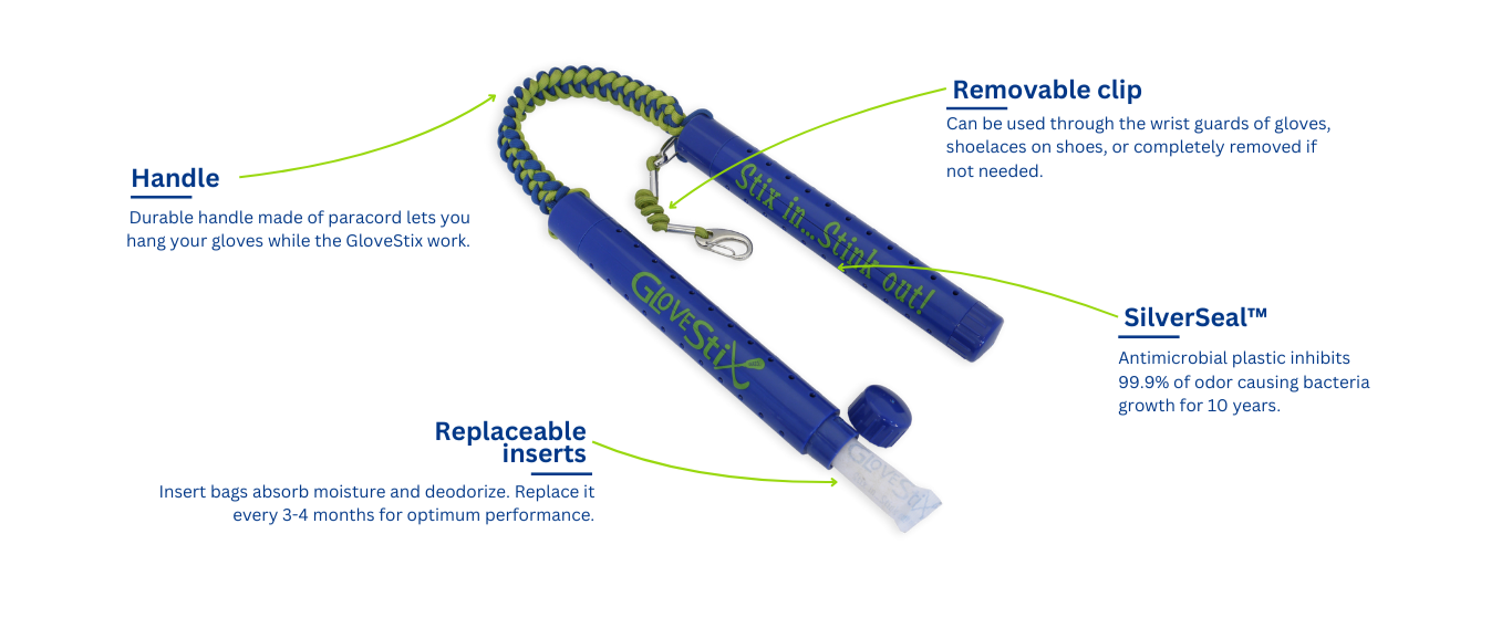 GloveStix are a pair of 2 plastic tubes with Silver Seal technology and is the best way to get rid of the glove odor. When placed in gloves after use, GloveStix will deodorize the gloves odor by absorbing moisture and inhibiting the growth of 99.9% of odor causing bacteria in as little as 24 hours.