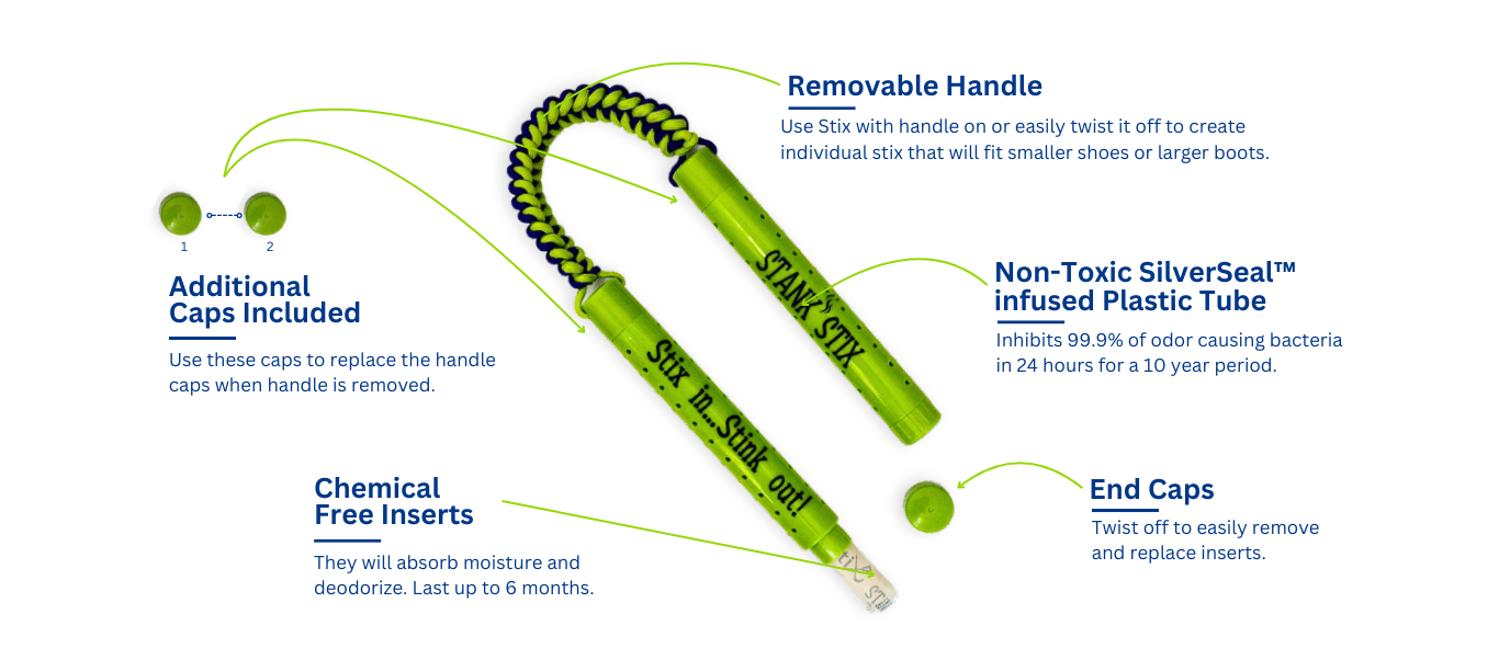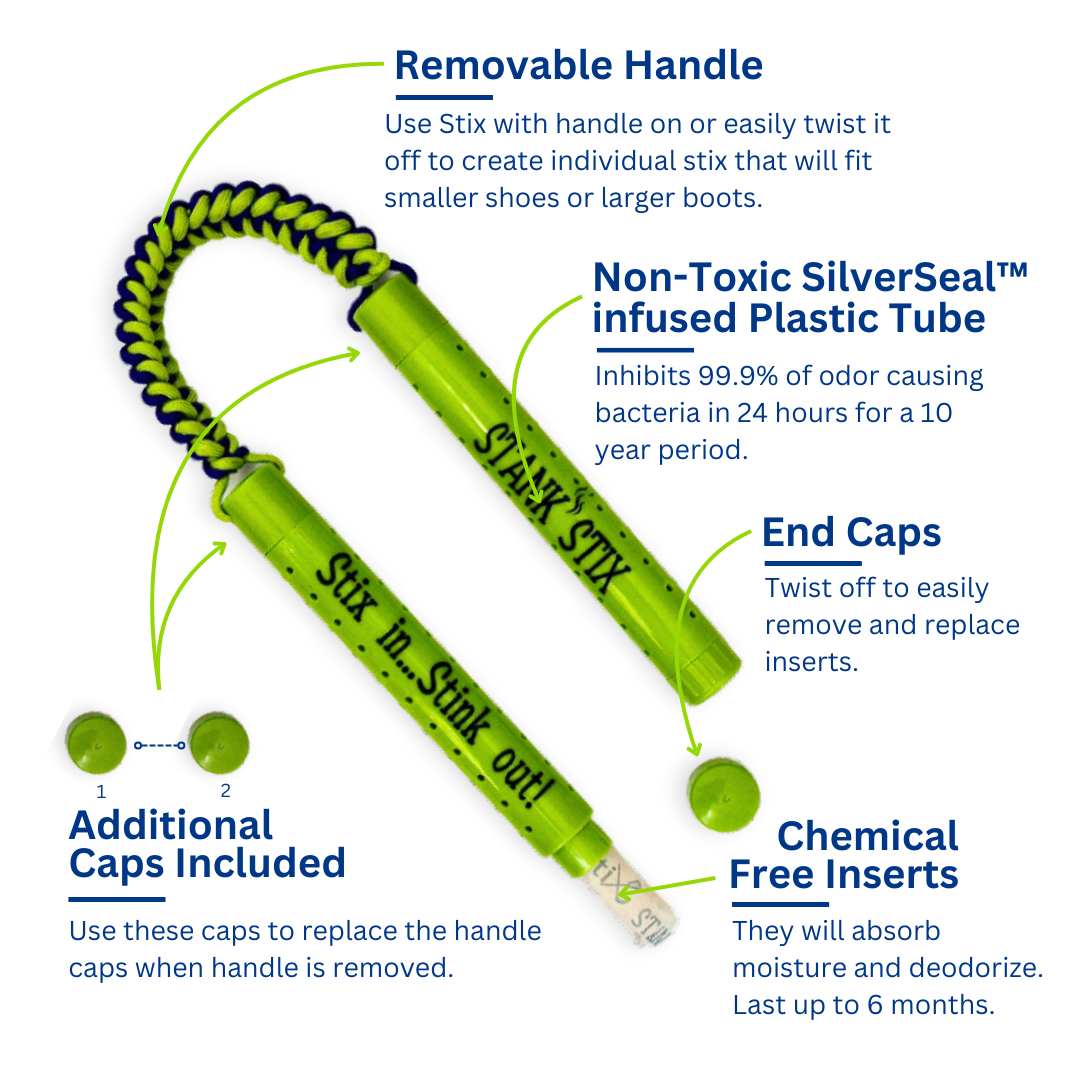 The StankStix use the same technology as GloveStix. The only difference is the StankStix have two extra end caps and a removable handle to operate the Stix separately. StankStix are an effective odor removal product for shoes and more.