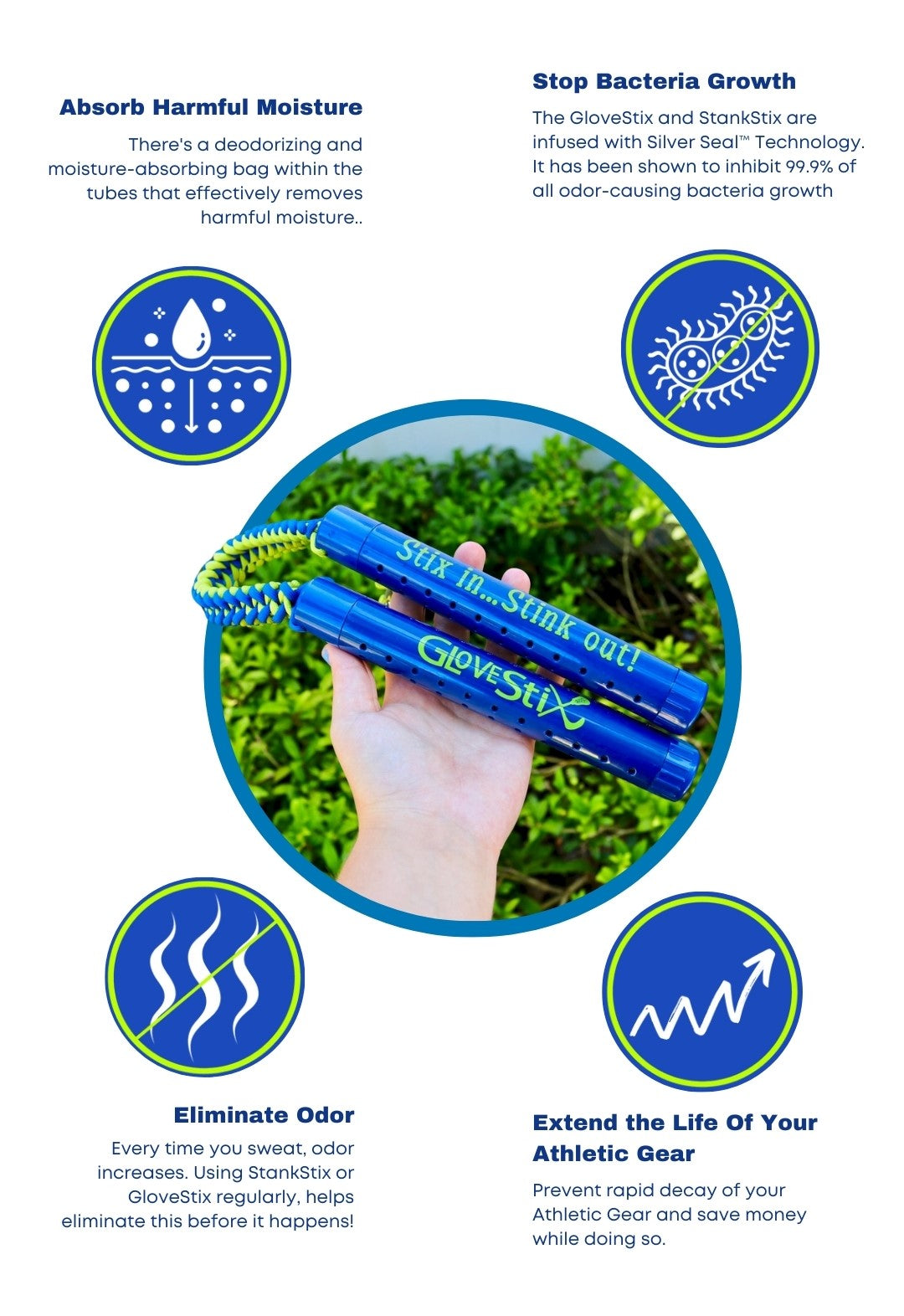 GloveStix and StankStix are an award winning and patented odor management system. When placed into your gloves, shoes or more after practice or games they will absorb harmful moisture, eliminate odors and inhibit 99.9% of odor-causing bacteria growth on the product surface for a 10 yr period!